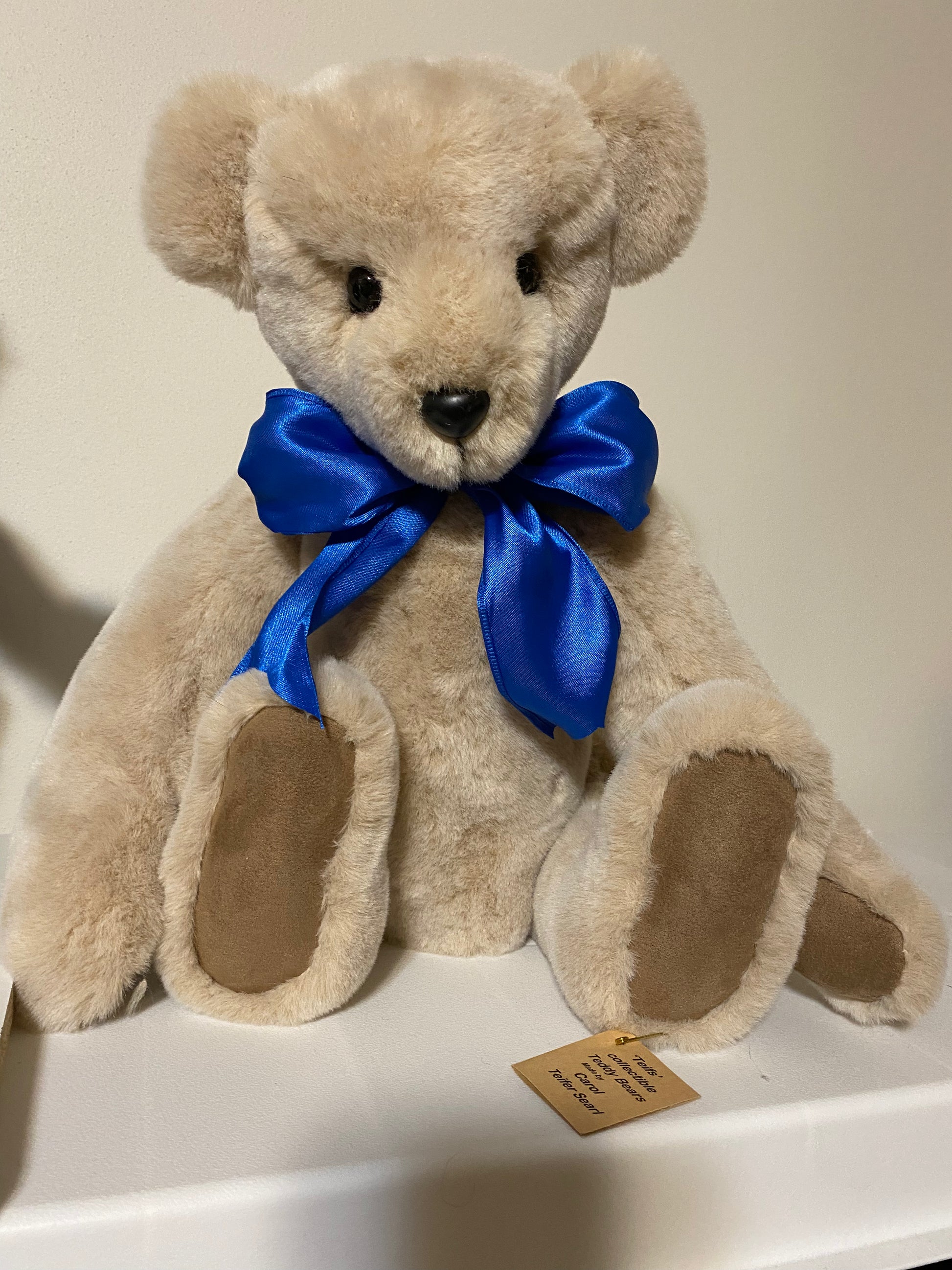 Bring home a timeless treasure with this handcrafted 22" collectible teddy bear, made from soft and luxurious beige plush fabric. Designed with meticulous attention to detail, this bear features German glass eyes that give it a lifelike and soulful expression, along with suede footpads for an elegant touch.